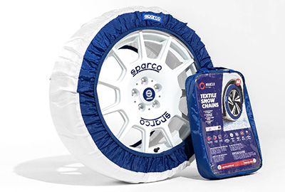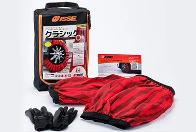 降雪時の寒い場所で、素早く、ラクに、確実に装着可能。軽くて扱いやすい画期的な布製タイヤチェーン。